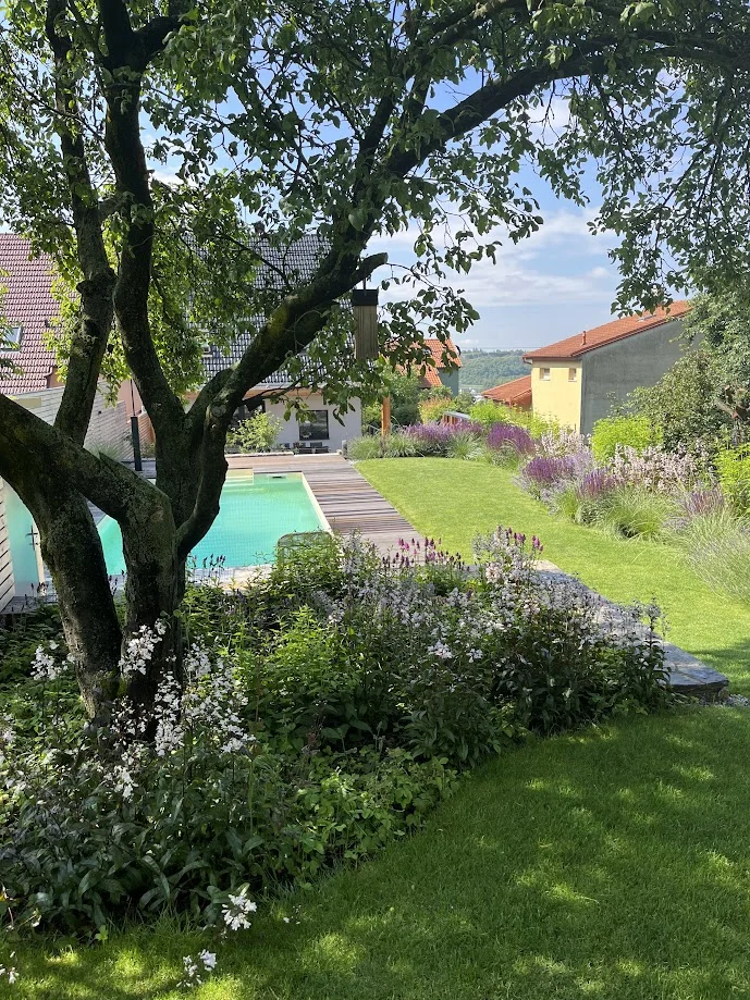 Rekonstrukci zahrady v Líšni jsme projektovali během roku 2022 a hned v roce následujícícm jsme ji zrekonstruovali. Návrh odstraňoval dosluhující palisádové stěny, schodiště z vymývaného betonu, k zemi šel i stříbrný smrk. V rámci rekonstrukce jsme vybudovali nové opěrné zdi, položili kobercový trávník a vysadili trvalkové záhony. V průběhu našich prací se rekonstruoval plot a bazén.