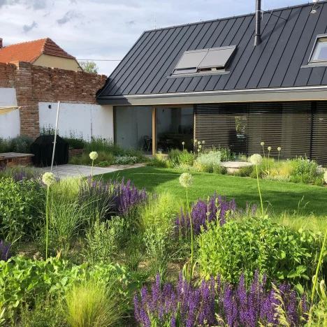 Koncept zahrady v Moravkém Krumlově Polánce vymyslel její majitel Ing. Arch. Radek Pasterný. Na nás bylo navrhnout a dodat trvalkové záhony. Předzahrádka je laděná do bílé barvy s akcentem růžové, tak aby vynikla před skvělou černou fasádou.