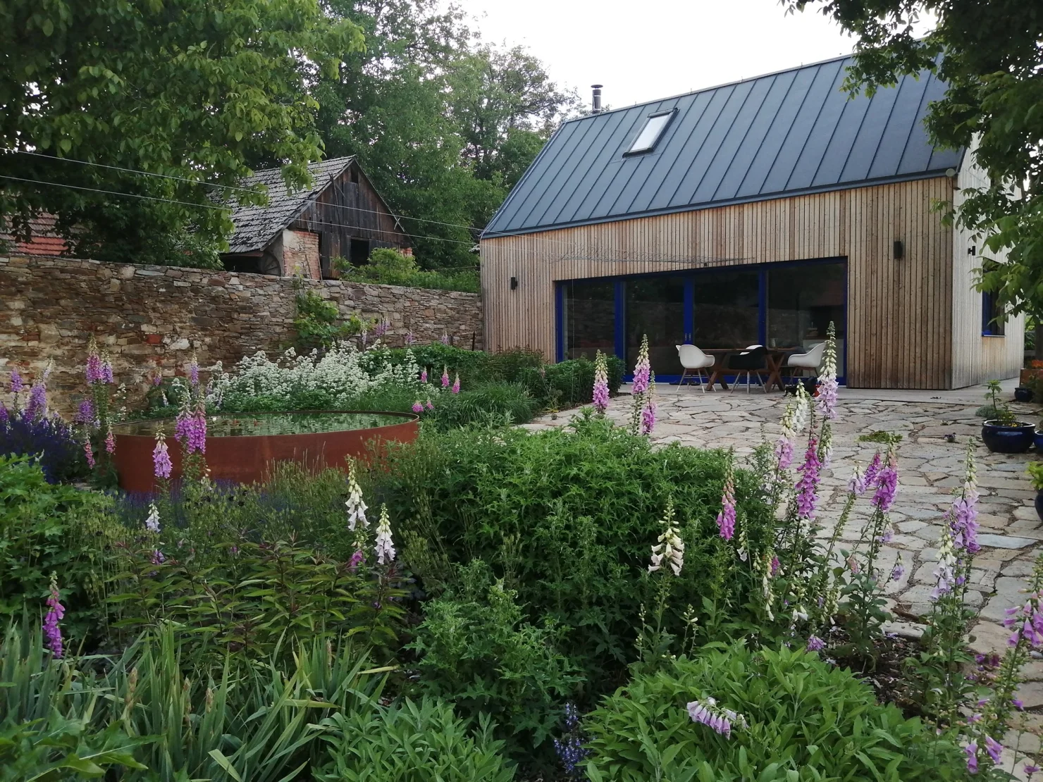 Zahradu v Sudicích jsme navrhovali pro kamarády. Prostoru vévodí cortenový vodní prvek s lekníny. Kolem něj je vysazen zajímavý sortiment trvalek, jemuž dominuje paznehtík a juka. Zahrada je cenná použitím výhradně místního kamene.